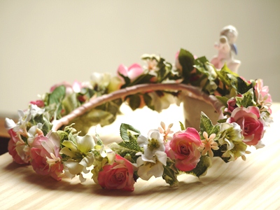 この写真、私事で大変恐縮なのですが、下の妹の結婚式に合わせて近所のアーティストの方にお願いして作っていただいた、娘の「花冠」です。